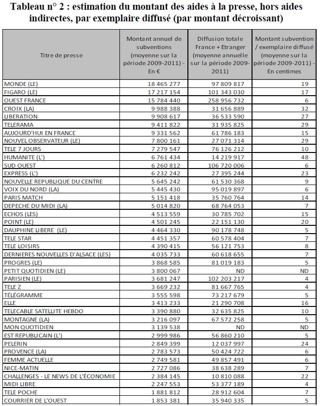 Avant la Première Guerre mondiale, la presse comptait plus de 300 quotidiens qui tiraient parfois à 2.5 millions d’exemplaires par jour ; aujourd’hui, c’est moins de 50 quotidiens qui appartiennent tous à des groupes de presse, eux-mêmes propriété de financiers internationaux et dont les ventes diminuent comme peau de chagrin. L’avènement d’Internet et des quotidiens gratuits (subventionnés par la publicité) a sonné le glas des journaux papiers : plus un seul quotidien n’est capable de trouver un équilibre financier ; cette presse ne survit que par de larges subventions de l’Etat. Par exemple, les chiffres catastrophiques de ventes du journal Libération de M. Rothschild (80 000 exemplaires par jour) reflètent parfaitement la situation : personne ne veut plus payer pour des journaux qui ne nous apprennent rien et se contentent de reprendre, à 95%, les dépêches de l’Agence France Presse (AFP). Comme dans toutes les entreprises privées, les effectifs des rédactions ont payé les restructurations au prix fort et un cercle vicieux s’est enclenché : plus d’argent pour le journalisme d’investigation, plus de vente donc plus de revenus publicitaires.