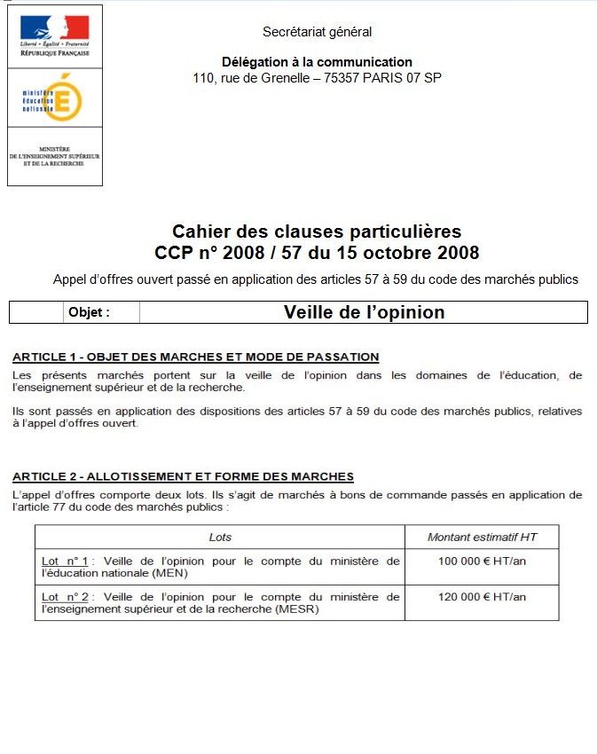 Déjà en France en 2008, le ministère de l’Éducation Nationale de Xavier Darcos avait publié un appel d’offre commun avec le Ministère de l’Enseignement Supérieur et de la Recherche de Valérie Pécresse, d’une valeur totale de 220 000 euros par an. L’objectif affiché était l’identification des sources d’information et des lieux de débats, sur Internet, qui pouvaient constituer un « risque opinion » et provoquer des crises impliquant les ministères[3].