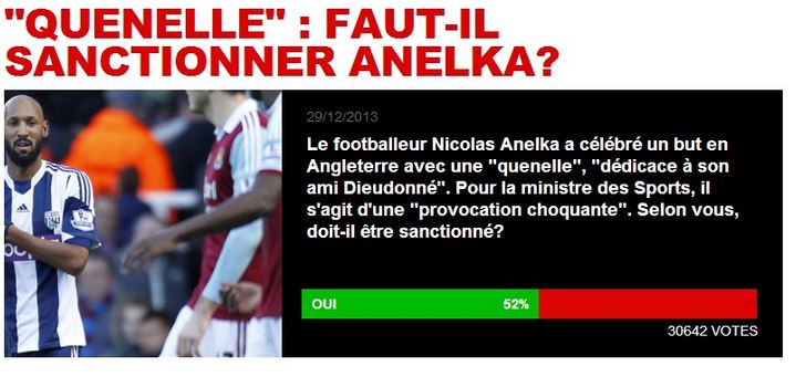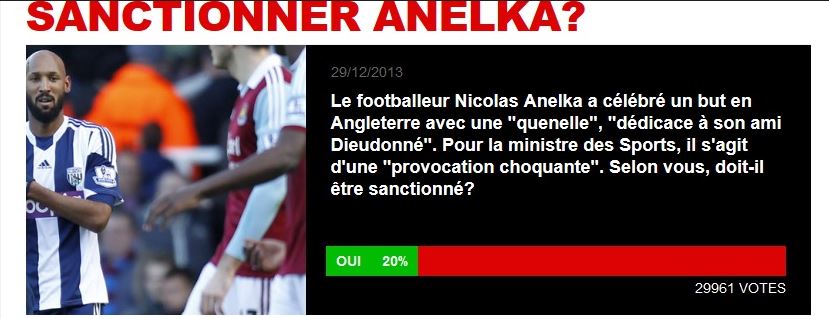 Nos amis de la presse de masse sont vraiment incorrigibles ! La dernière « bizarrerie » en date vient de la chaine d’information n°1 en France, BFM TV (du groupe NextRadioTV, qui détient également la radio RMC). Le 29 décembre dernier, un sondage a été lancé sur le thème de la Quenelle suite au geste de soutien de Nicolas Anelka à l’humoriste Dieudonné.